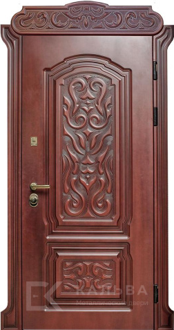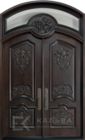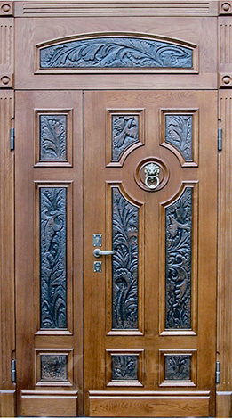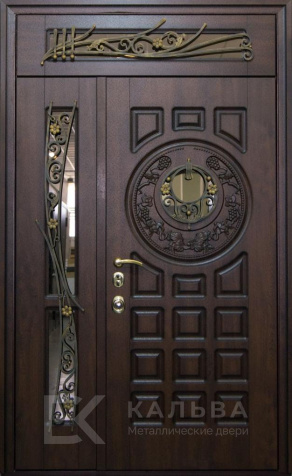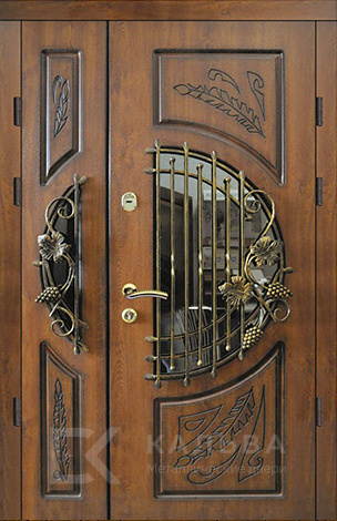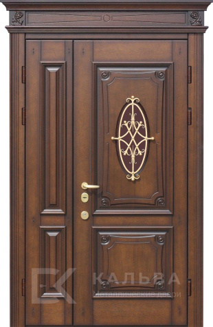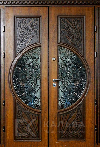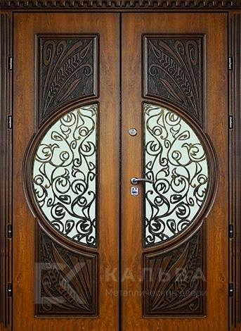 Фото «Входная двустворчатая дверь с ковкой и стеклом для дома №104»